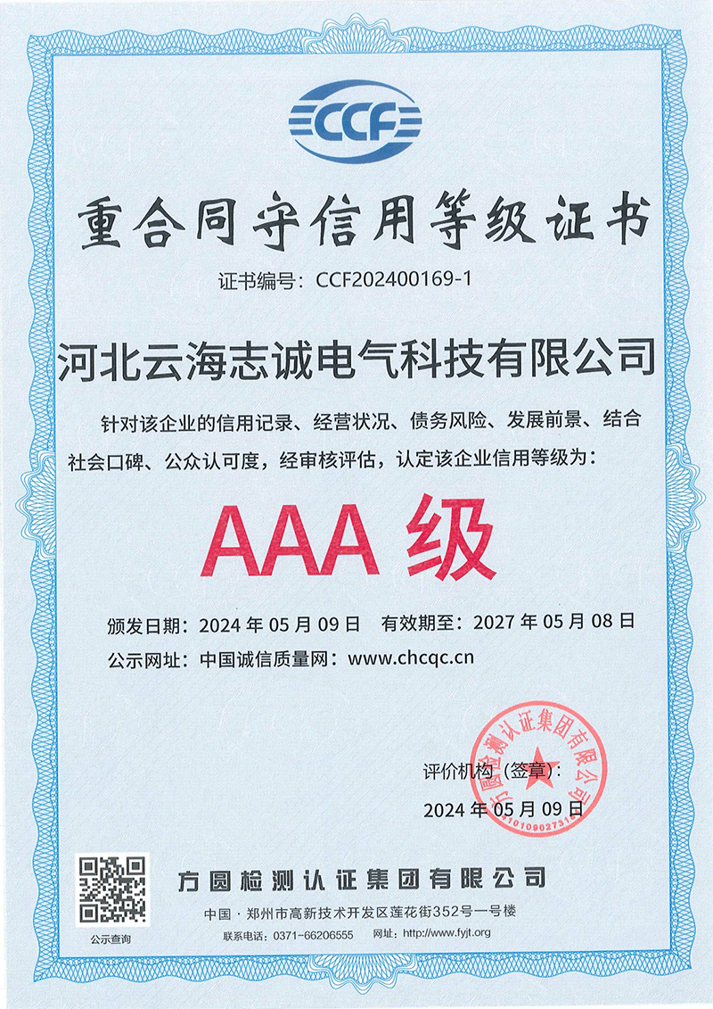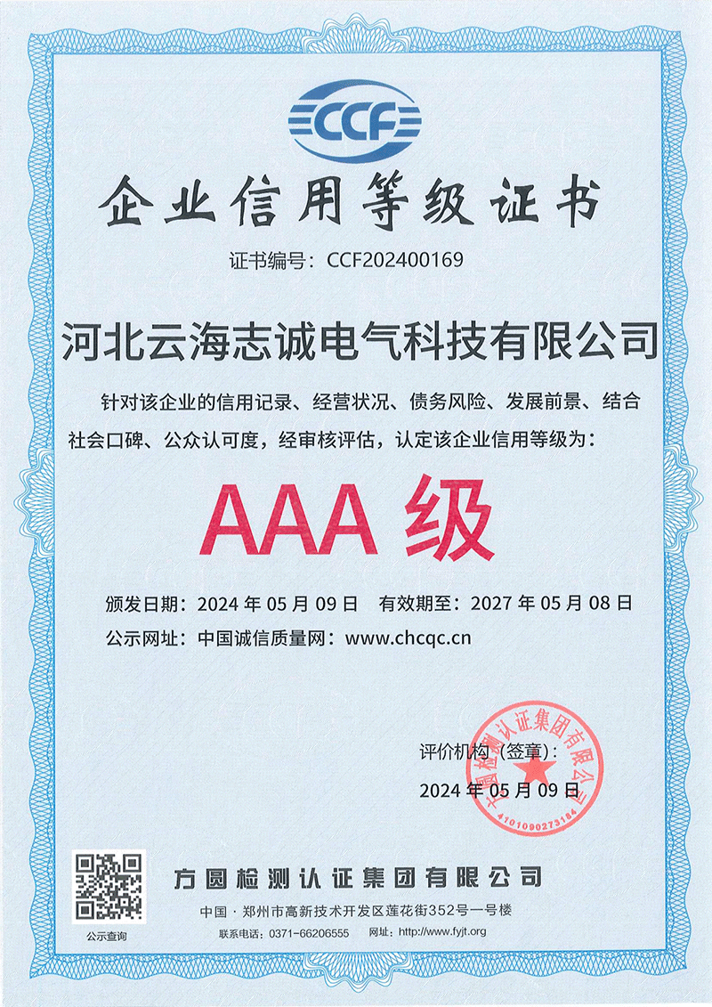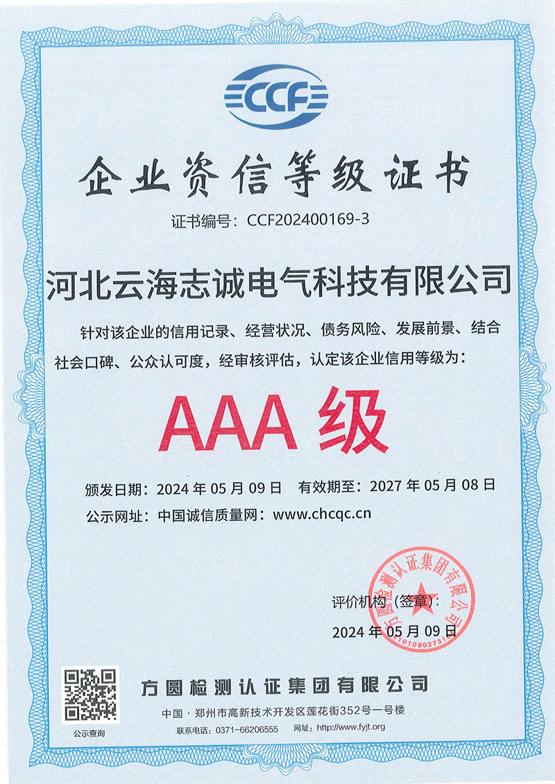Hebei Yunhai Zhicheng Electric Technology Co., Ltd. has passed ISO9001 international quality management system certification, ISO14001 environmental management system certification, ISO45001 health system certification, AAA enterprise credit certification. Its products have obtained national product type inspection reports, 3C certificates, China Energy saving certification, and multiple patent certificates and software copyright certificates. The company has also been recognized as a technology-based small and medium-sized enterprise and a national high-tech enterprise in Hebei Province in 2023.