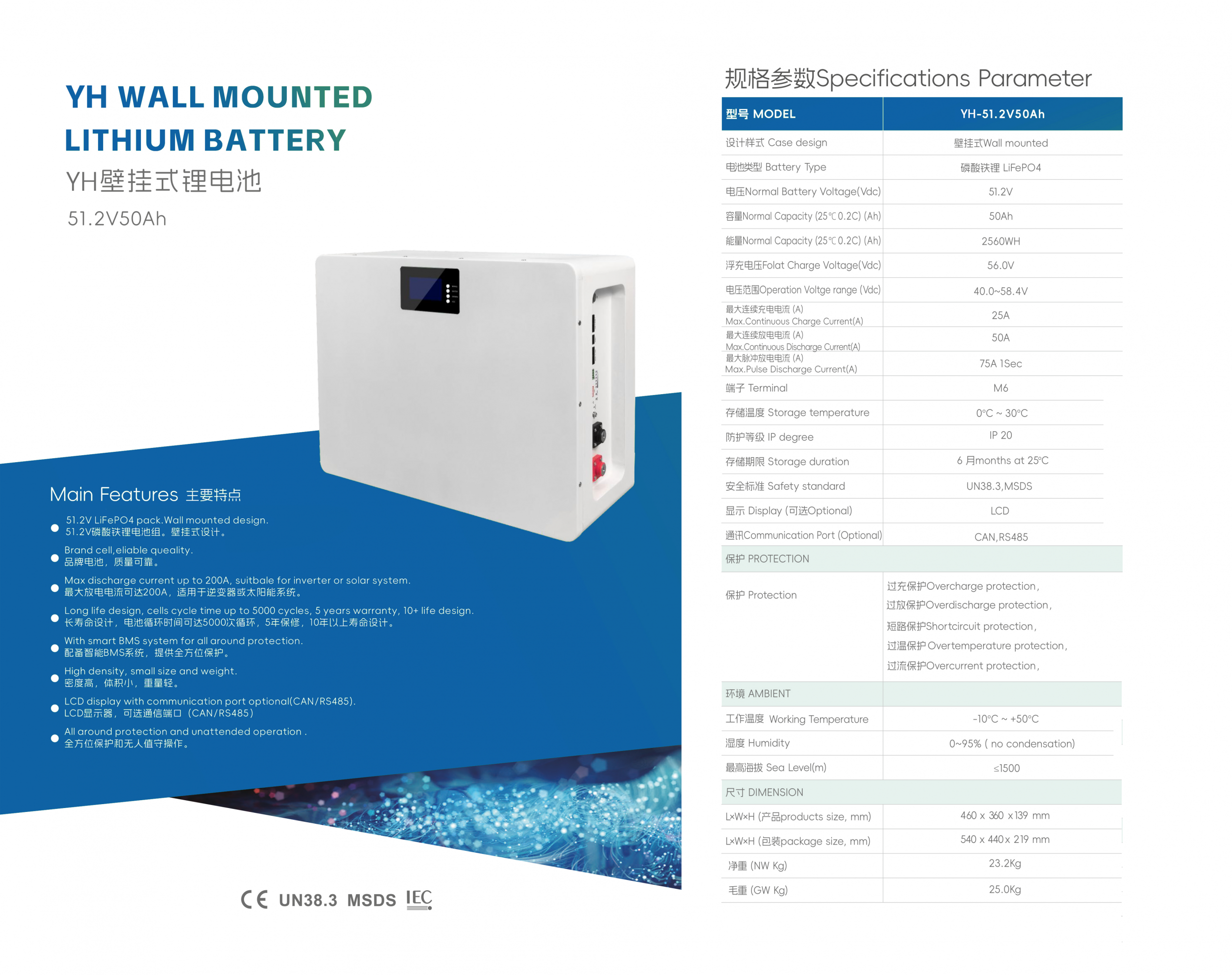Wall-mounted lithium battery YH51.2V50AH/2569WH
